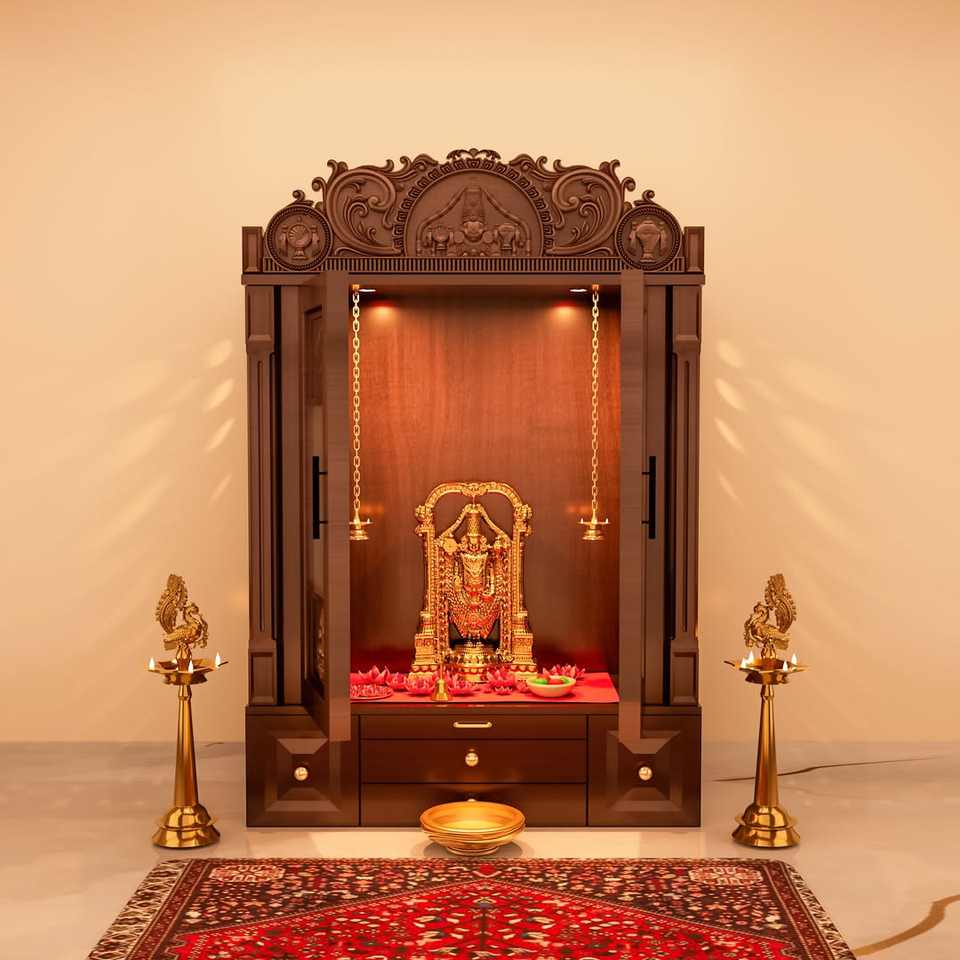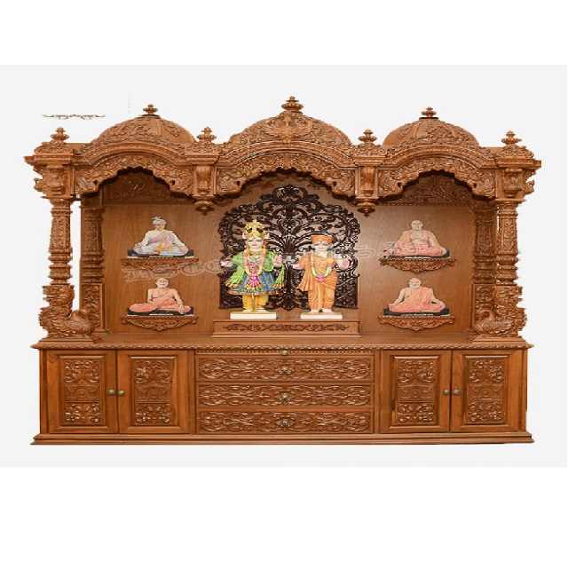 หิ้งบูชาไม้สักขนาดใหญ่ทรงสามโดม พร้อมช่องเก็บของ งานแกะสลักด้วยมือ สำหรับบูชาที่บ้าน แบบฮินดู รุ่นโคลัมบัส