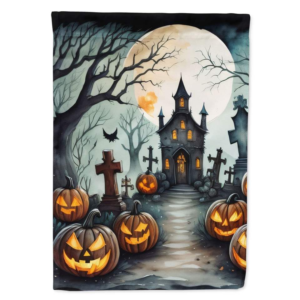 ธงบ้านฮาโลวีนรูปสุสานน่ากลัวขนาดใหญ่หลากสีเสาสำหรับตกแต่งลานแบนเนอร์งานศิลปะโพลีเอสเตอร์แขวนผนัง