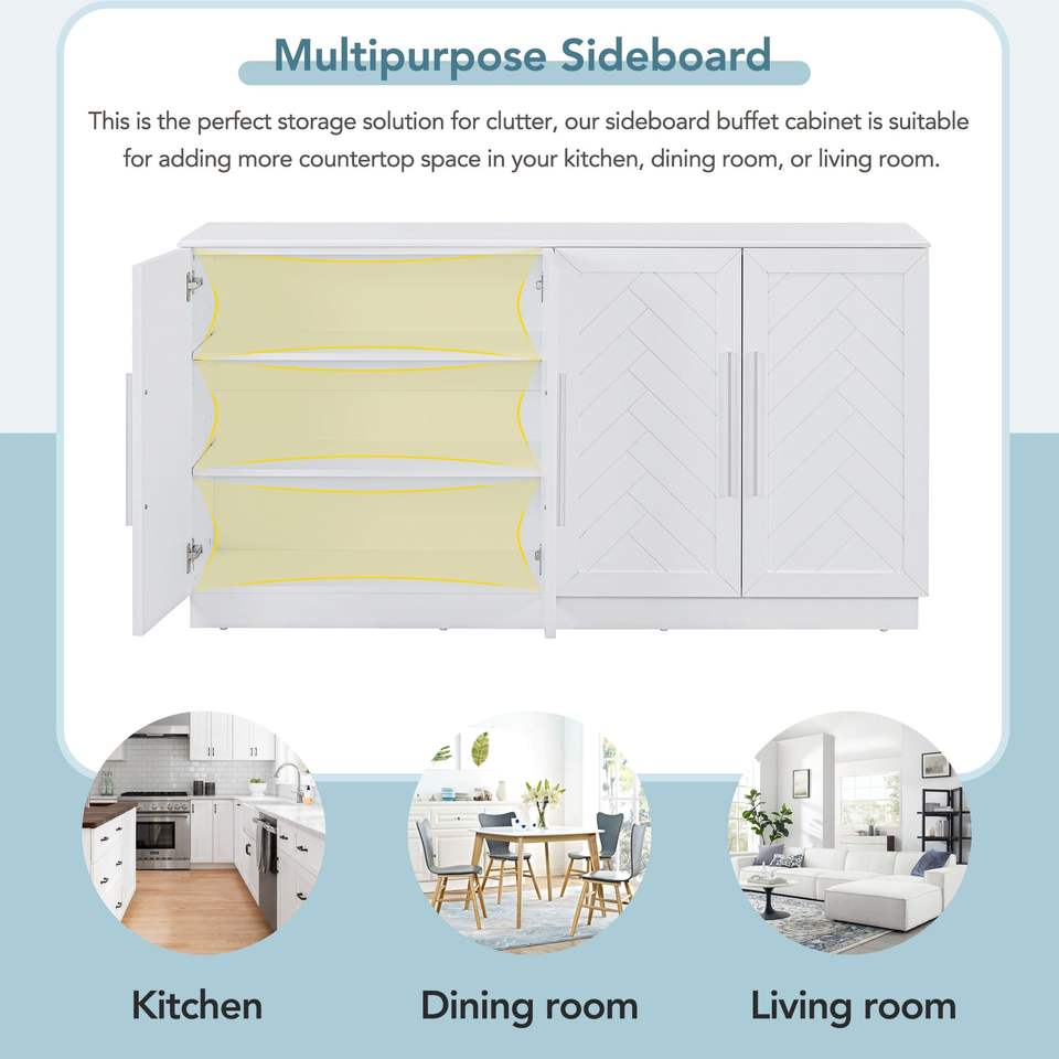 ตู้บุฟเฟ่ต์พื้นที่จัดเก็บขนาดใหญ่พร้อมตู้ข้าง 4 ประตูสำหรับห้องครัวห้องรับประทานอาหารชั้นวางปรับได้หูจับสีเงิน