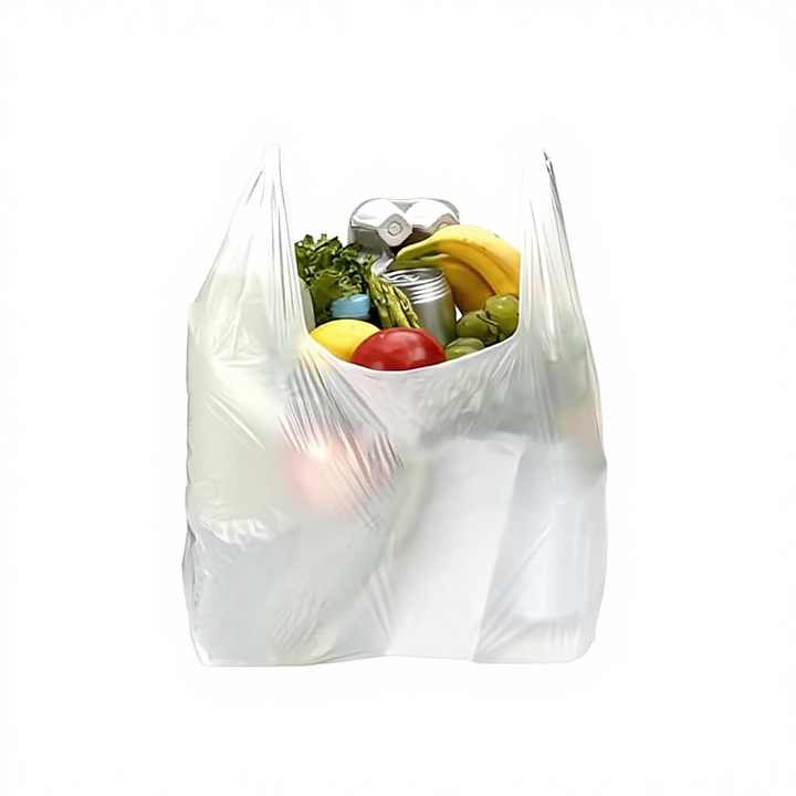 ถุงช้อปปิ้งเสื้อยืดสีขาวขนาดใหญ่แบบใช้แล้วทิ้ง ปิดผนึกด้วยความร้อน สำหรับร้านค้าปลีก ร้านขายของชำ และอาหารแบบนำกลับบ้าน ผลิตจากโพลีเอทิลีนความหนาแน่นสูง (HDPE)