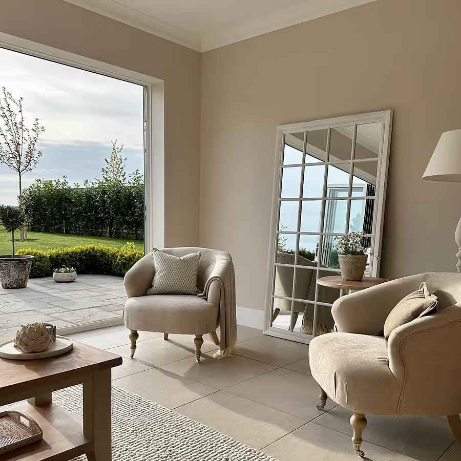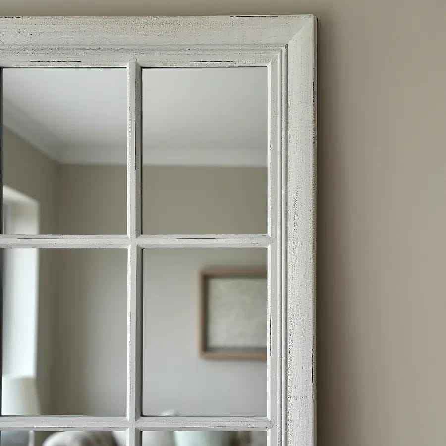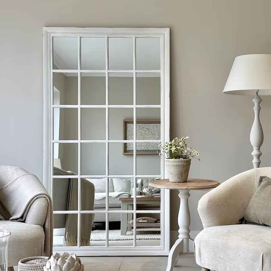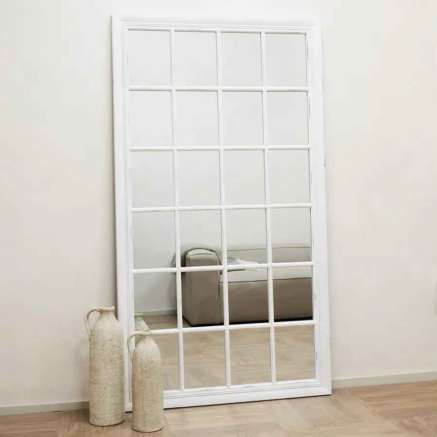 กระจกตั้งพื้นทรงหน้าต่างไม้สีขาวขนาดใหญ่ กรอบลายตาราง ทำด้วยมือ ดีไซน์สแกนดิเนเวียน สไตล์บ้านไร่ โมเดิร์น สำหรับตกแต่งห้องนั่งเล่น
