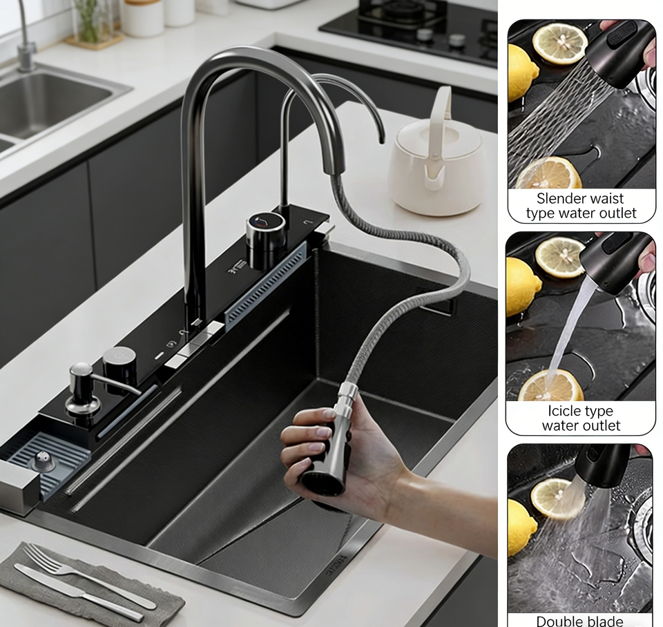 อ่างล้างจานครัวขนาดใหญ่แบบสองหลุม ทำจากสแตนเลสอย่างดี พร้อมก๊อกน้ำแบบดึงลงทรงโค้งสูงสำหรับห้องครัว