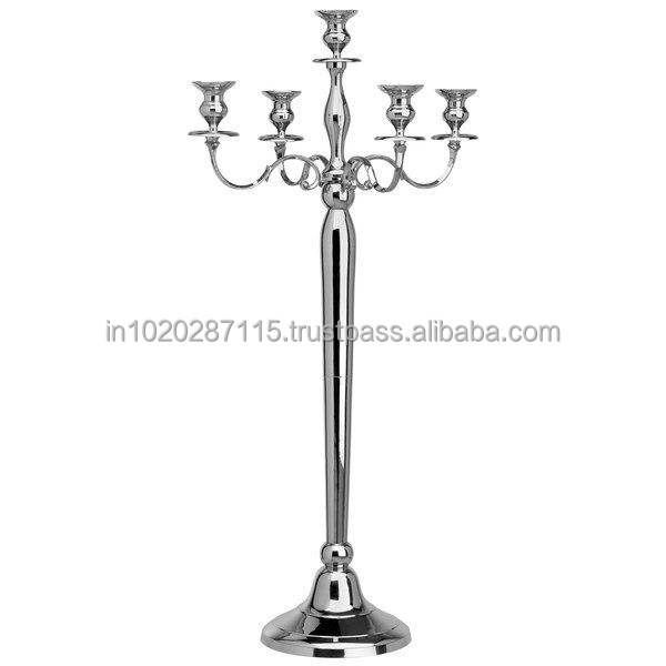 เชิงเทียนโลหะสีเงินขนาดใหญ่ประดับกลางโต๊ะสำหรับจัดเลี้ยงในห้องจัดเลี้ยงเหมาะสำหรับงานแต่งงานและการต้อนรับ