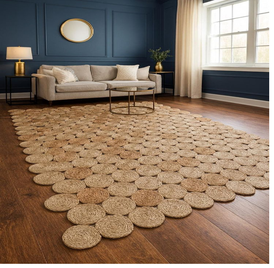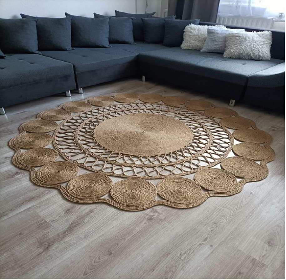 พรมปูพื้นทรงกลมขนาดใหญ่ทำจากผ้าปอกระเจา พร้อมดีเทลสีครีมสองเฉดเพื่อเพิ่มความสดใสให้กับห้องที่มีสไตล์ มีจำหน่ายในราคาขายส่ง