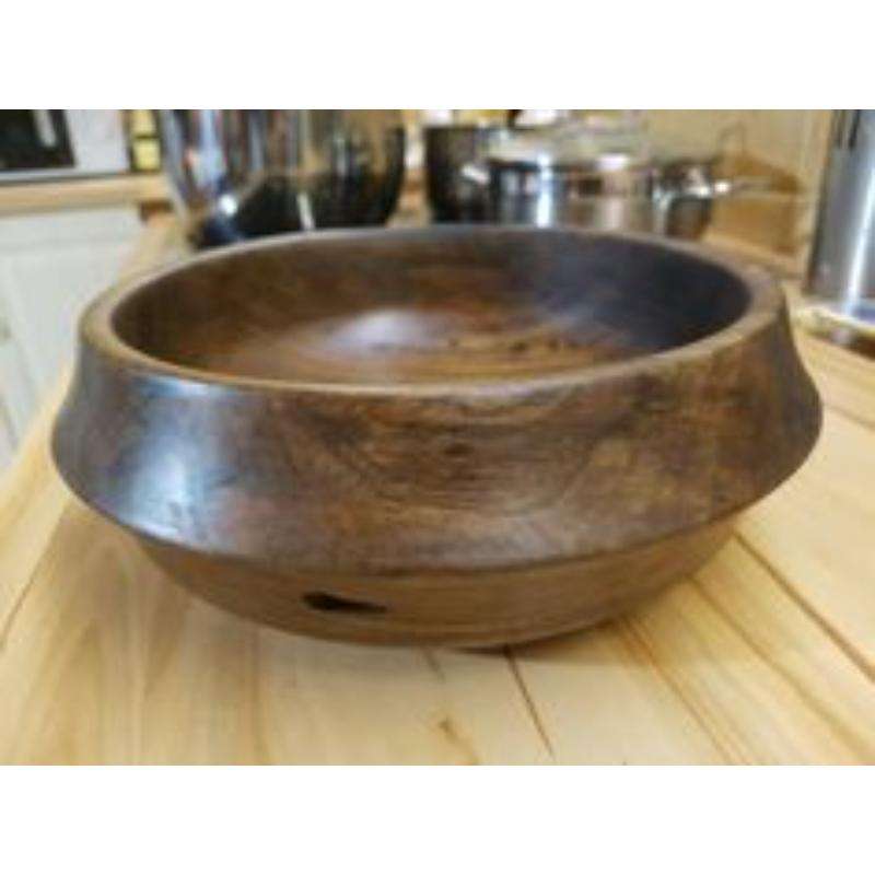 ชามเสิร์ฟทำจากไม้แนวชนบทขนาดใหญ่พร้อมพื้นผิวธรรมชาติสำหรับบ้านไร่ที่วางกลางโต๊ะรับประทานอาหารในห้องครัว