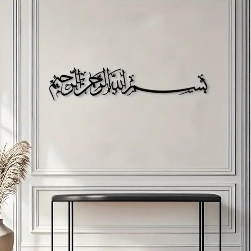 งานศิลปะติดผนังเหล็กหล่อขนาดใหญ่สไตล์อาร์ตเดโค ลายอักษรอาหรับบิสมิรา พร้อมคำแปลภาษาอังกฤษ แบบเขียนด้วยมือขวา