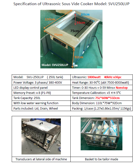 เครื่องทำอาหารซูวีดขนาดใหญ่ 250 ลิตร ระบบสั่นสะเทือนอัลตราโซนิก ให้ความร้อนสม่ำเสมอ ผลิตได้จำนวนมาก รสชาติอร่อยขึ้น เนื้อนุ่มขึ้น