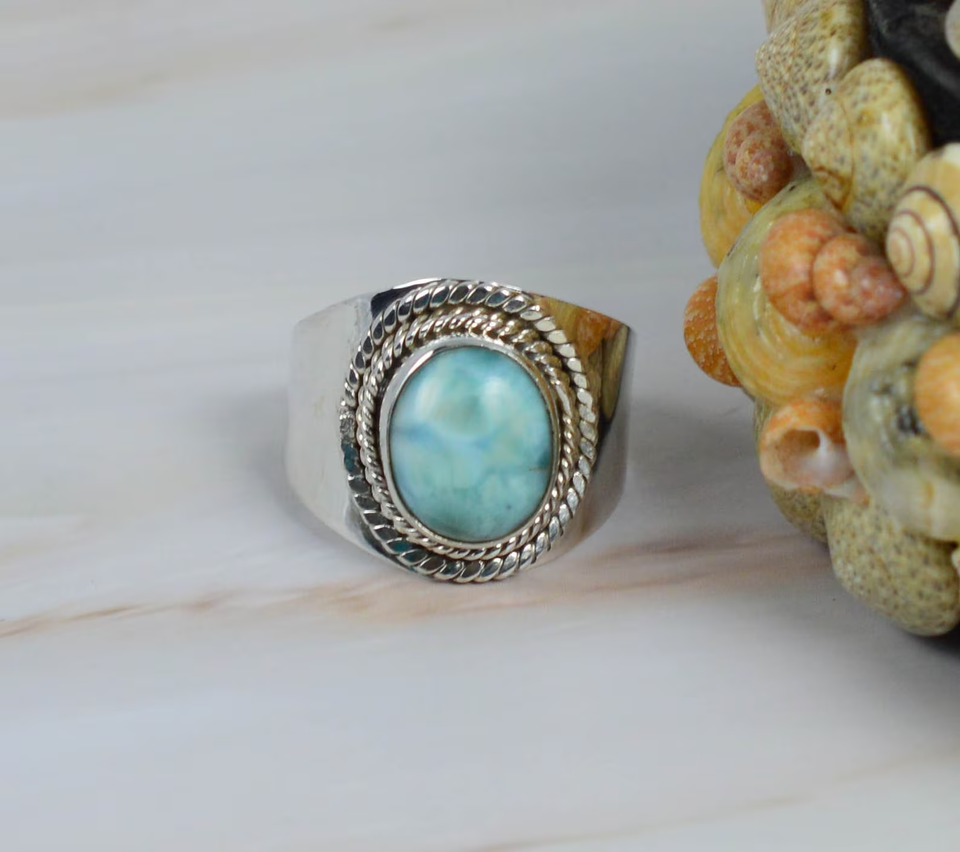 แหวนพลอยลาริมาร์ เงินแท้ 925 แหวนพลอยสีน้ำเงิน งานแฮนด์เมด เครื่องประดับสไตล์ทะเล แหวนโบโฮ แหวนดีไซน์โดดเด่น แหวนงานฝีมือที่ไม่เหมือนใคร