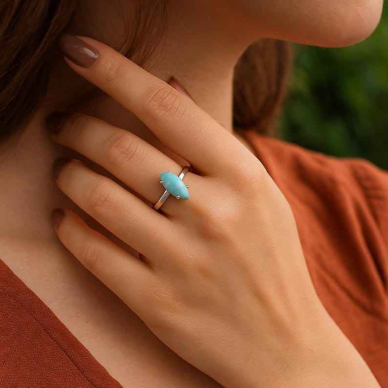 Larimar Marquise แหวนเงินสเตอร์ลิงแหวนพลอยทะเลสีฟ้าเครื่องประดับหินคาริบเบียนที่งดงามของขวัญแหวนเงินสไตล์โบโฮสำหรับเธอ