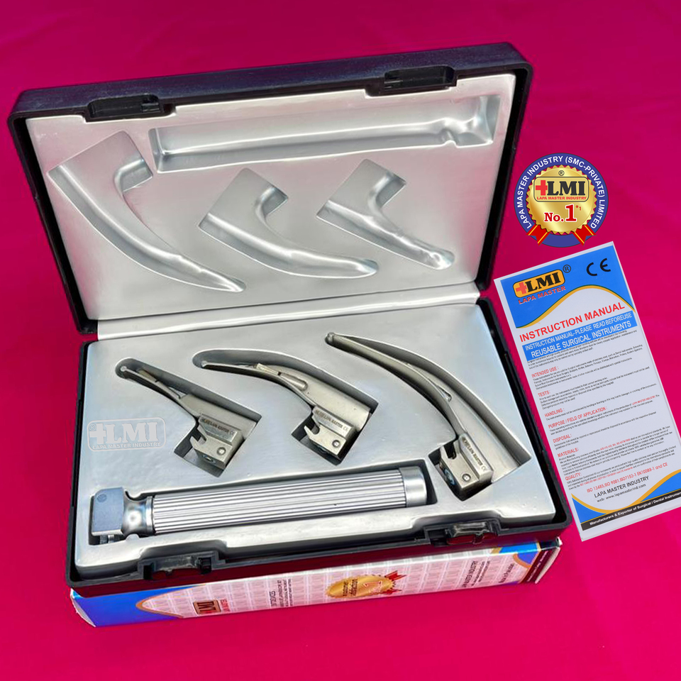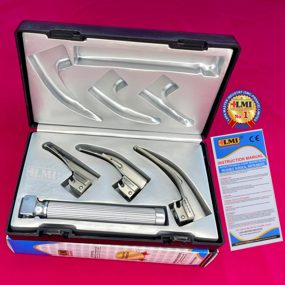 100 ชุด แบรนด์ LMI บรรจุ 20 ชุดต่อกล่อง ใน 5 กล่องใหญ่, กล่องกระดาษแข็ง LMI Brand 20 ชุด บรรจุใน 1 กล่องใหญ่, กล่องกระดาษลูกฟูก ขนาด 30*25*5 ซม. กล่องกระดาษลูกฟูก ขนาด 50*31*27 ซม., ชุด Laryngoscope Macintosh คุณภาพพรีเมียม ผลิตจากใบมีดสแตนเลส AISI 304 ใบมีดและด้ามจับทั้งหมดเป็นไปตามมาตรฐาน ISO 7376 สามารถอบฆ่าเชื้อด้วยเครื่องนึ่งไอน้ำได้