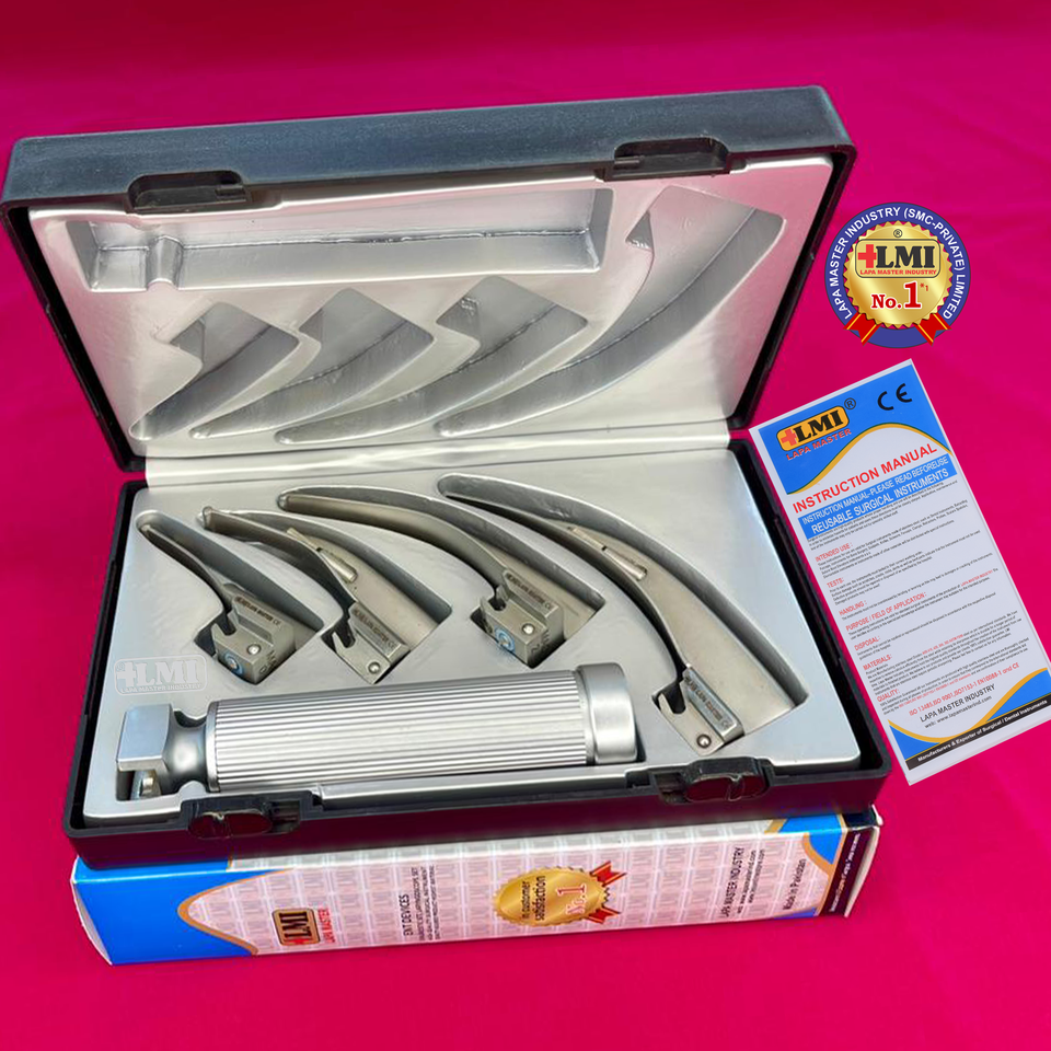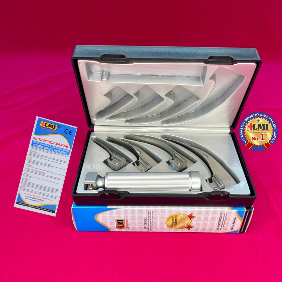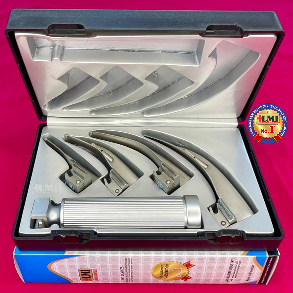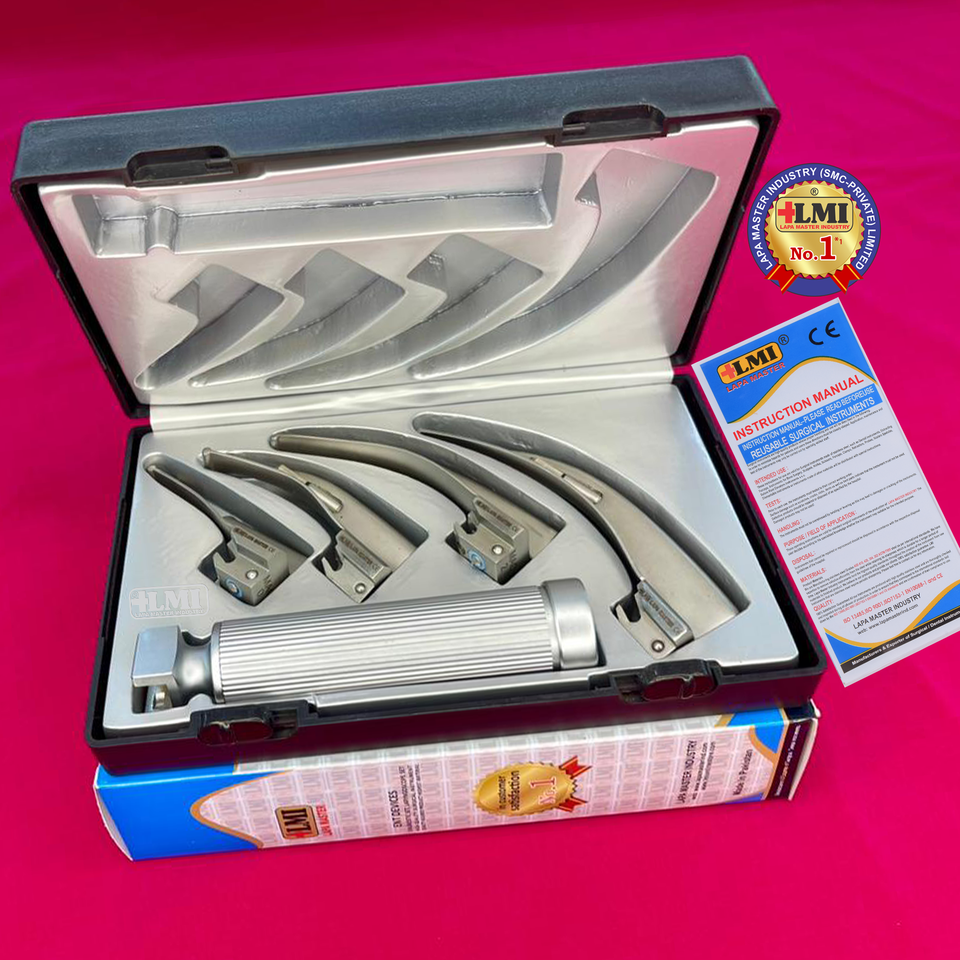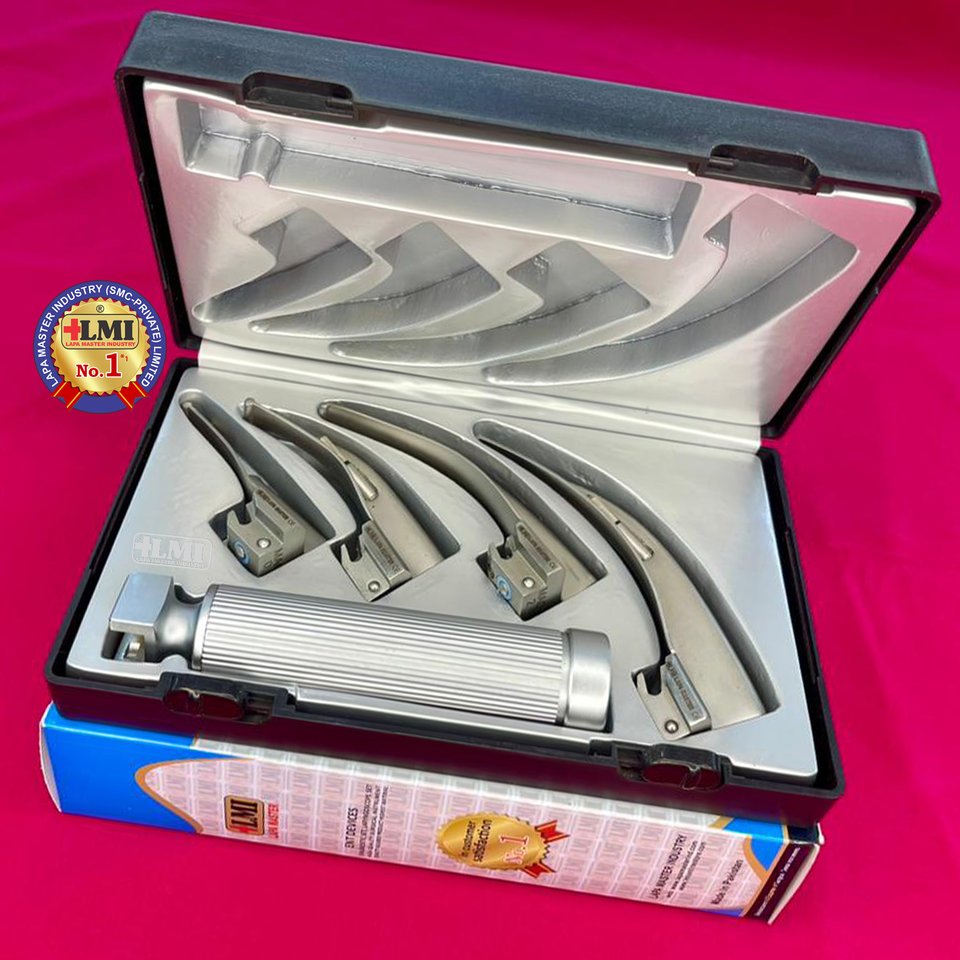 สเปค:กล่องกระดาษลูกฟูก ขนาด 30*25*5 ซม. กล่องกระดาษลูกฟูก ขนาด 50*31*27 ซม., กล่องกระดาษแข็ง LMI Brand 20 ชุด บรรจุในหนึ่งกล่องใหญ่, 100 ชุด แบรนด์ LMI บรรจุ 20 ชุดต่อกล่อง ใน 5 กล่องใหญ่, ชุด Laryngoscope Macintosh คุณภาพพรีเมียม ผลิตจากใบมีดสแตนเลส AISI 304 ใบมีดและด้ามจับทั้งหมดเป็นไปตามมาตรฐาน ISO 7376 สามารถอบฆ่าเชื้อด้วยเครื่องนึ่งไอน้ำได้