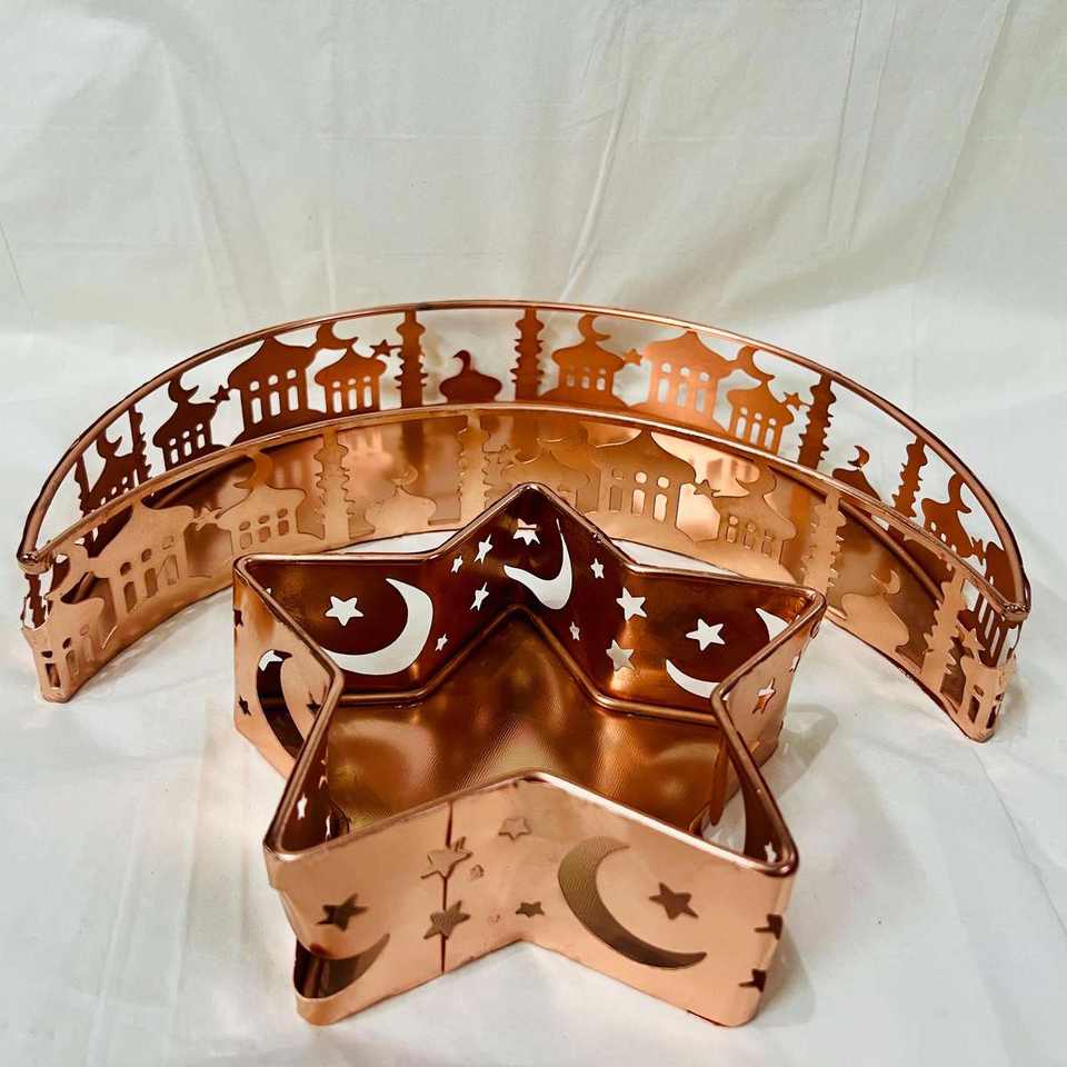 ถาดโลหะลายดวงจันทร์และดวงดาวตัดด้วยเลเซอร์ สีทองและโรสโกลด์ ชุดถาดเสิร์ฟสำหรับรอมฎอนและอีด งานฝีมือทันสมัย ชุดตกแต่งหลายชิ้น