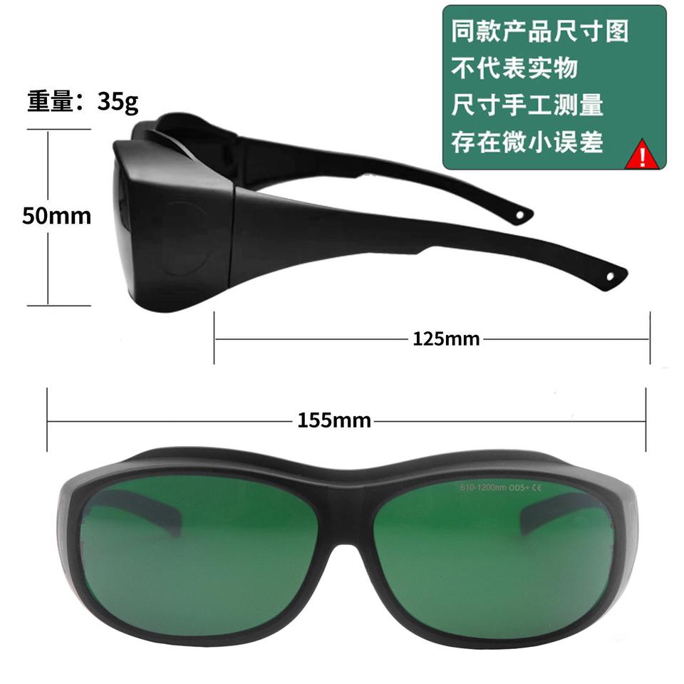 แว่นตานิรภัยแบบเลเซอร์ กรอบสีดำ 155 มม. สำหรับการกำจัดขน การบำบัดด้วยแสงเพื่อความงาม ป้องกันแสงสีแดง สีน้ำเงิน สีเขียว