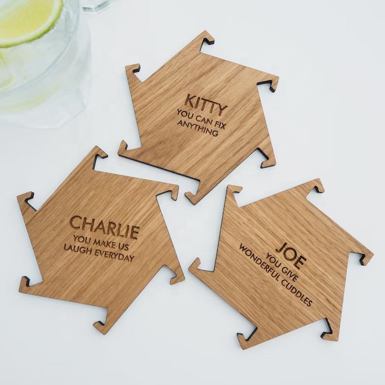 จานรองแก้วไม้ตัดด้วยเลเซอร์และถ้วยน้ําหกเหลี่ยมพร้อมแกะสลักชื่อแบรนด์ (ชื่อแกะสลักตามคําขอ)