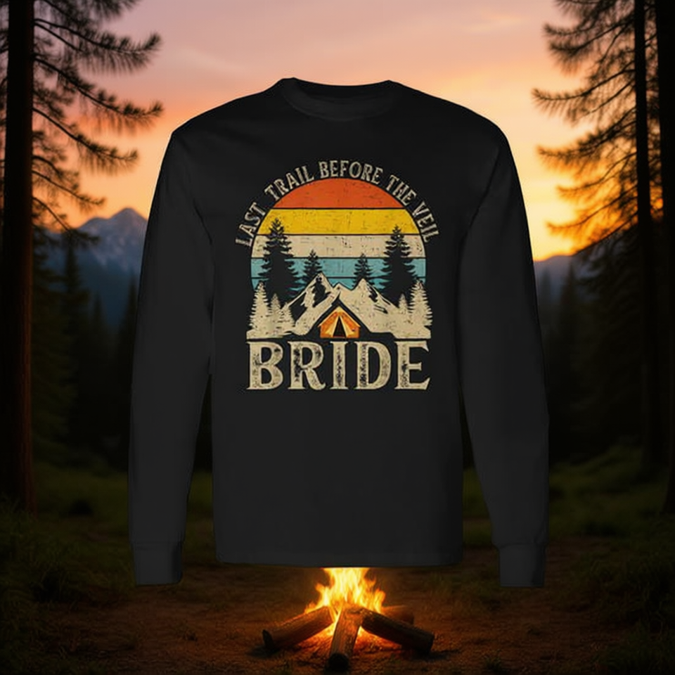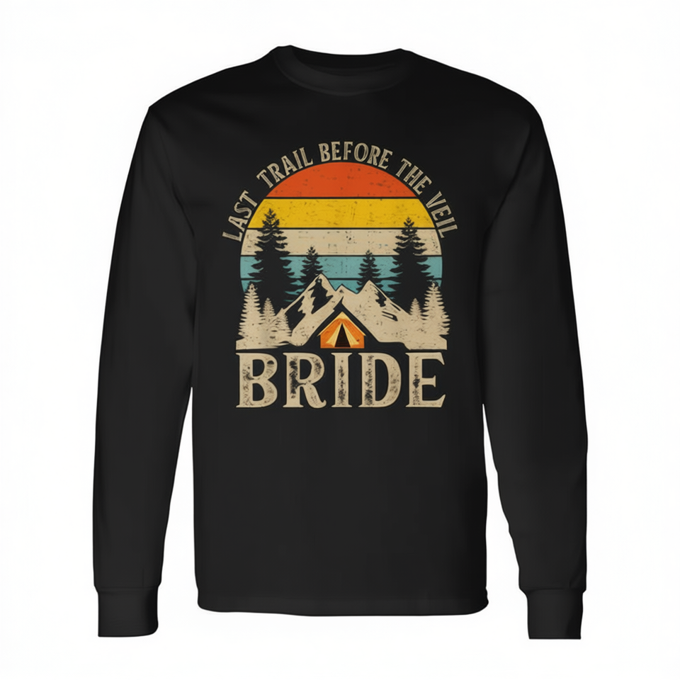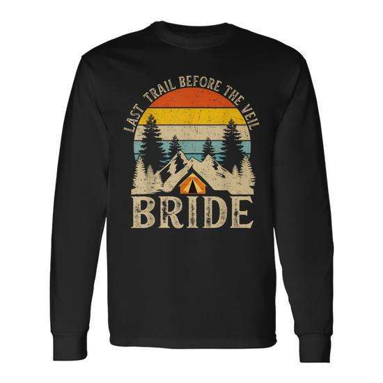 เสื้อยืดแขนยาวสไตล์วินเทจสำหรับงานเลี้ยงสละโสด "Last Trail Before the Veil Bride Retro Camp" เสื้อยืดโปรโมชั่นสไตล์วินเทจสำหรับเจ้าสาว