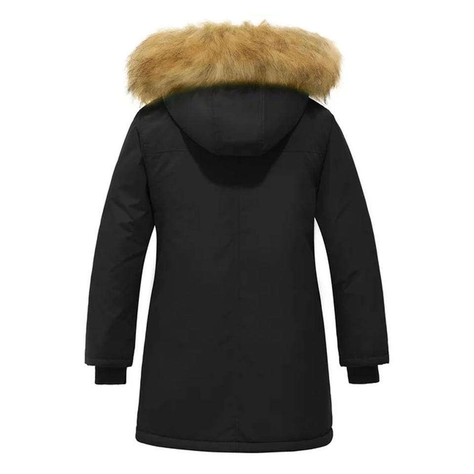 แจ็กเก็ตขนยาวสีดำมีฮู้ดสำหรับผู้หญิงขนาด8เสื้อโค้ทบุนวมฤดูหนาวล่าสุด2023ฤดูใบไม้ร่วง
