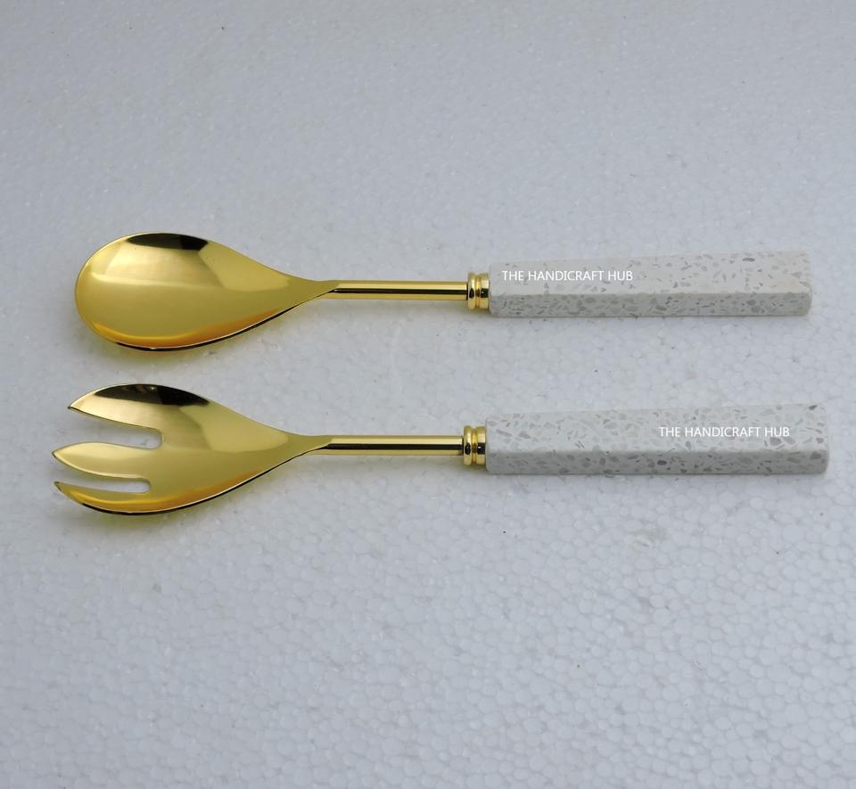 ชุดอุปกรณ์เสิร์ฟอาหารสแตนเลสสตีลรุ่นใหม่ล่าสุด พร้อมที่ตักสลัดชุบทองเหลือง ด้ามจับเรซิ่นสีขาว