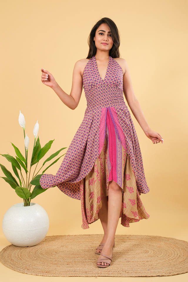 ชุดเดรสยาวสไตล์โบฮีเมียนแขนกุดเชือกผูกคอผ้าไหมพิมพ์ลายดอกไม้ชุดชายหาดซักได้เอวธรรมชาติ
