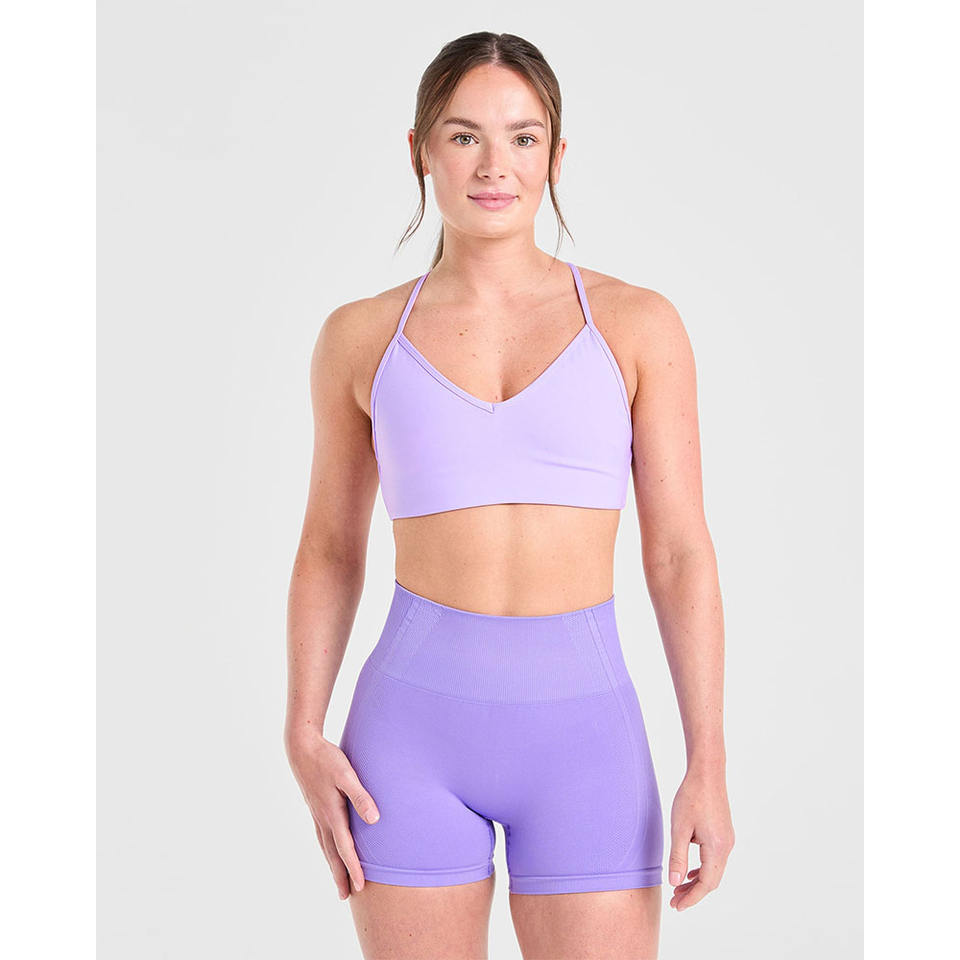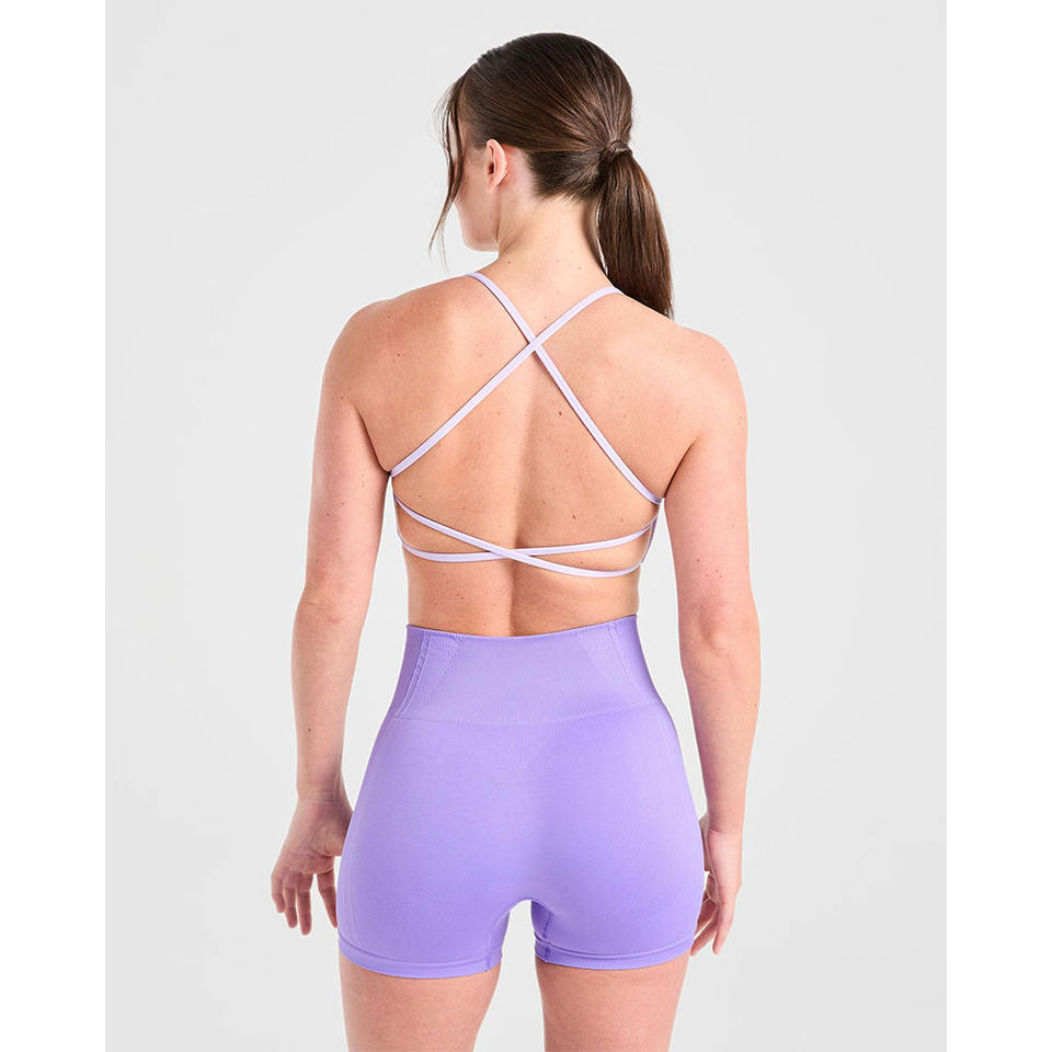 สปอร์ตบราสำหรับเล่นฟิตเนสของผู้หญิงผู้ใหญ่ที่ให้ผลกระทบสูงสายคล้องคอรูปตัววีสีม่วงสีพาสเทล