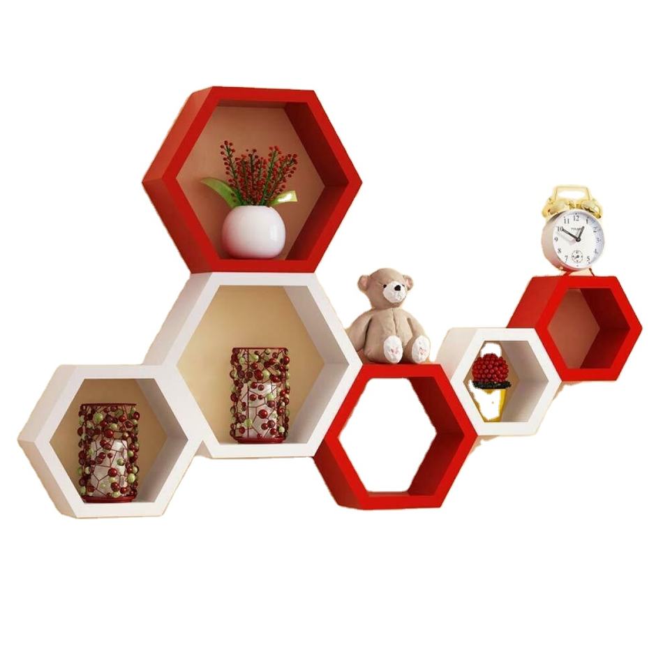 ชั้นวางของไม้ติดผนังทรงหกเหลี่ยมสีแดงและสีขาวสำหรับห้องนั่งเล่นและห้องออกกำลังกาย