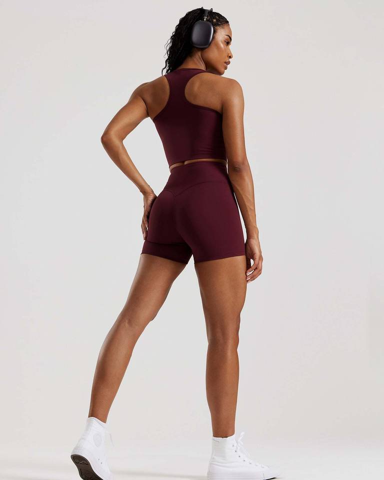 กางเกงขาสั้นเอวสูงสำหรับผู้หญิงกางเกงขาสั้นออกกำลังกายซับเหงื่อระบายอากาศได้ดีสีเชอร์รี่เข้มออกแบบได้ตามต้องการ
