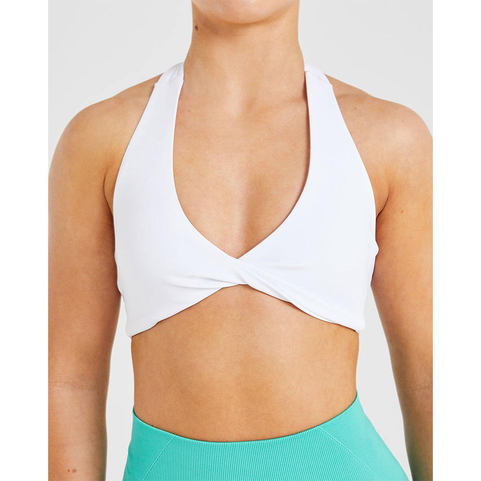 สปอร์ตบราคล้องคอสีขาวพร้อมคอวีเปิดหลังรายละเอียดและผลกระทบสูงสำหรับผู้หญิงผู้ใหญ่