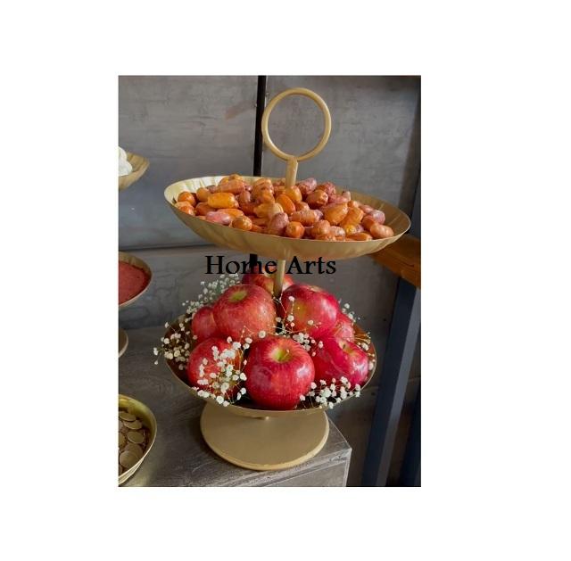 ที่วางเค้กโลหะ2ชั้นสำหรับงานแต่งงานที่วางช็อคโกแลตสีทองดีไซน์ล่าสุด
