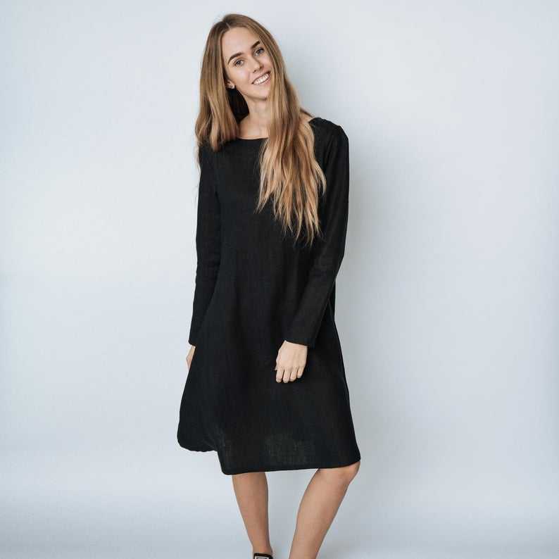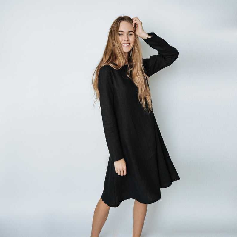 ดีไซน์ล่าสุด 2026 ชุดเดรสผ้าเครปสีดำสุดฮิต คอทรงโอ แขนยาว ความยาวระดับเข่า ผ้าลินินทรงเข้ารูปเอวธรรมชาติ