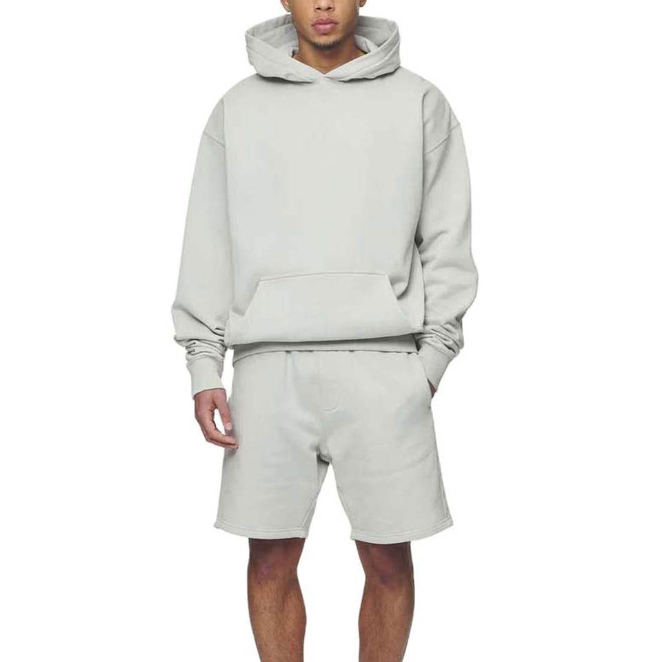ชุดเซ็ตเสื้อฮู้ดดี้และกางเกงขาสั้นผู้ชายทรงโอเวอร์ไซส์ ดีไซน์ล่าสุด ผ้าฟลีซคอตตอน 100% ระบายอากาศได้ดี สวมใส่สบาย
