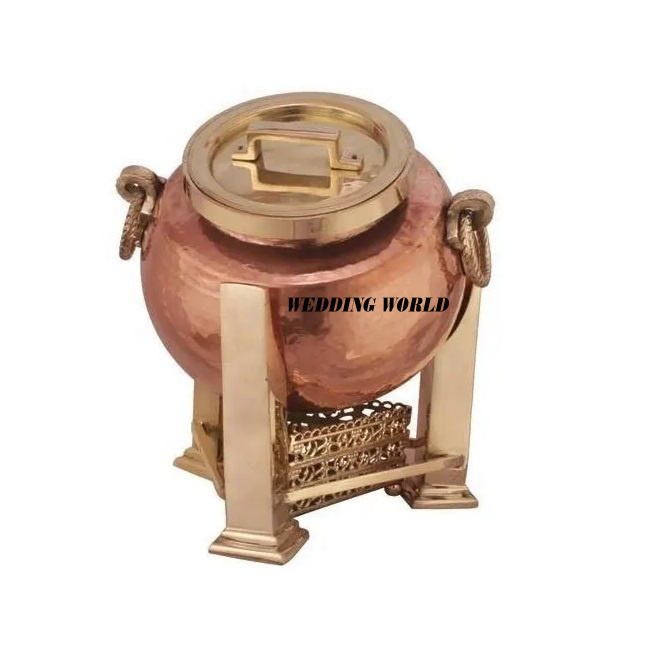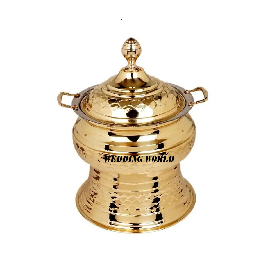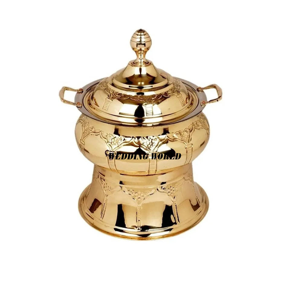การออกแบบล่าสุดทองเหลือง Chafing จานร้อนขายทําด้วยมืออาหารจานทรงกลมโต๊ะขายส่งโลหะอุ่นอาหาร