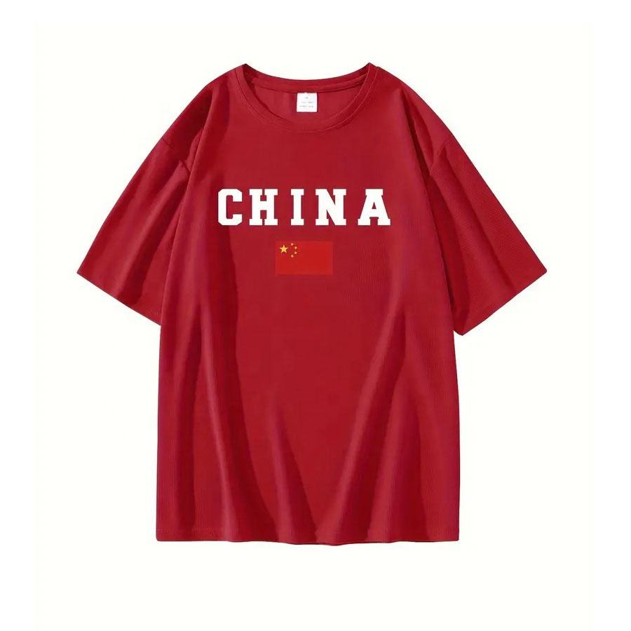 เสื้อยืดผู้ชายทรงโอเวอร์ไซส์ ดีไซน์ล่าสุด พิมพ์ลายธงชาติจีน คอกลม สไตล์สตรีทแวร์ รับสกรีนโลโก้