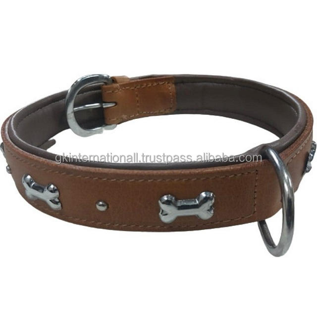 ปลอกคอสุนัขบุหนังแท้ที่ตกแต่งด้วยกระดุมและกระดูกปลอกคอสัตว์เลี้ยงหนังกว้างพิเศษใช้ได้ทุกวันดีไซน์ล่าสุด