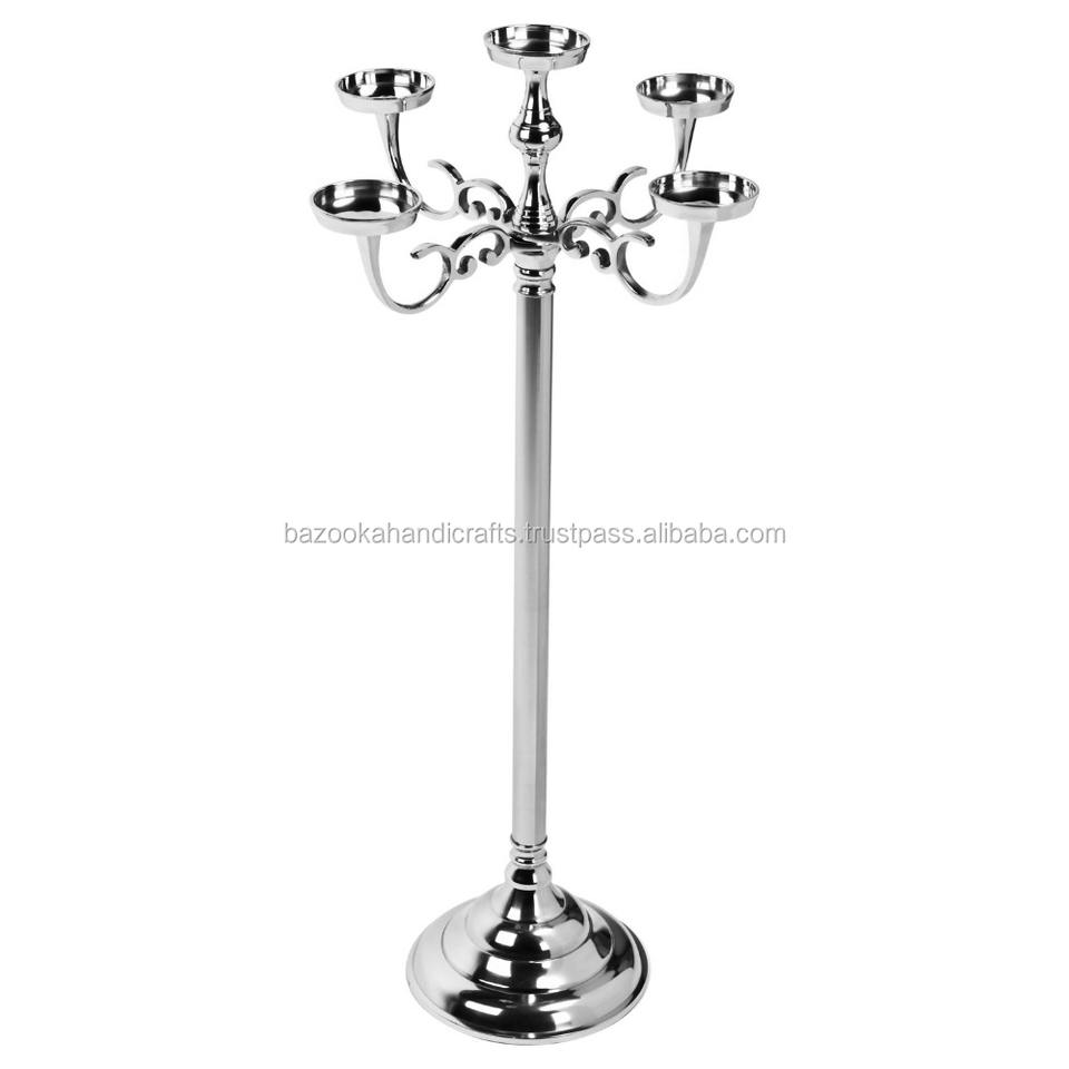 งานฝีมือโลหะที่ซับซ้อนทำจากอลูมิเนียมสีเงินตกแต่งงานแต่งงานเชิงเทียนห้าแขนดีไซน์ล่าสุด