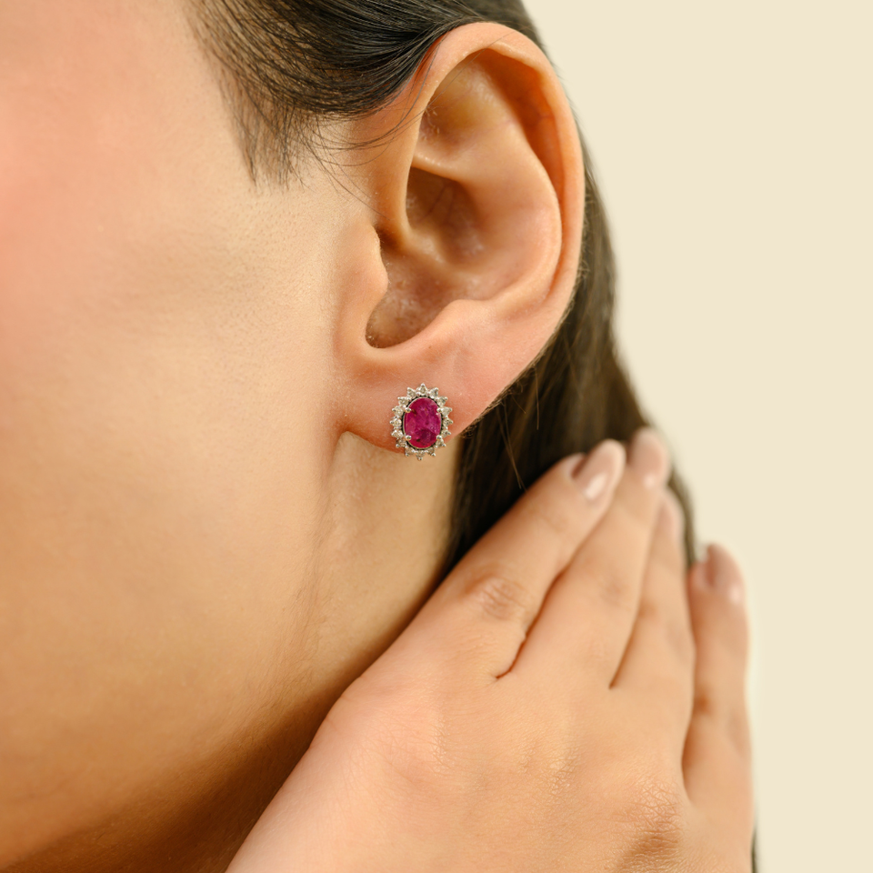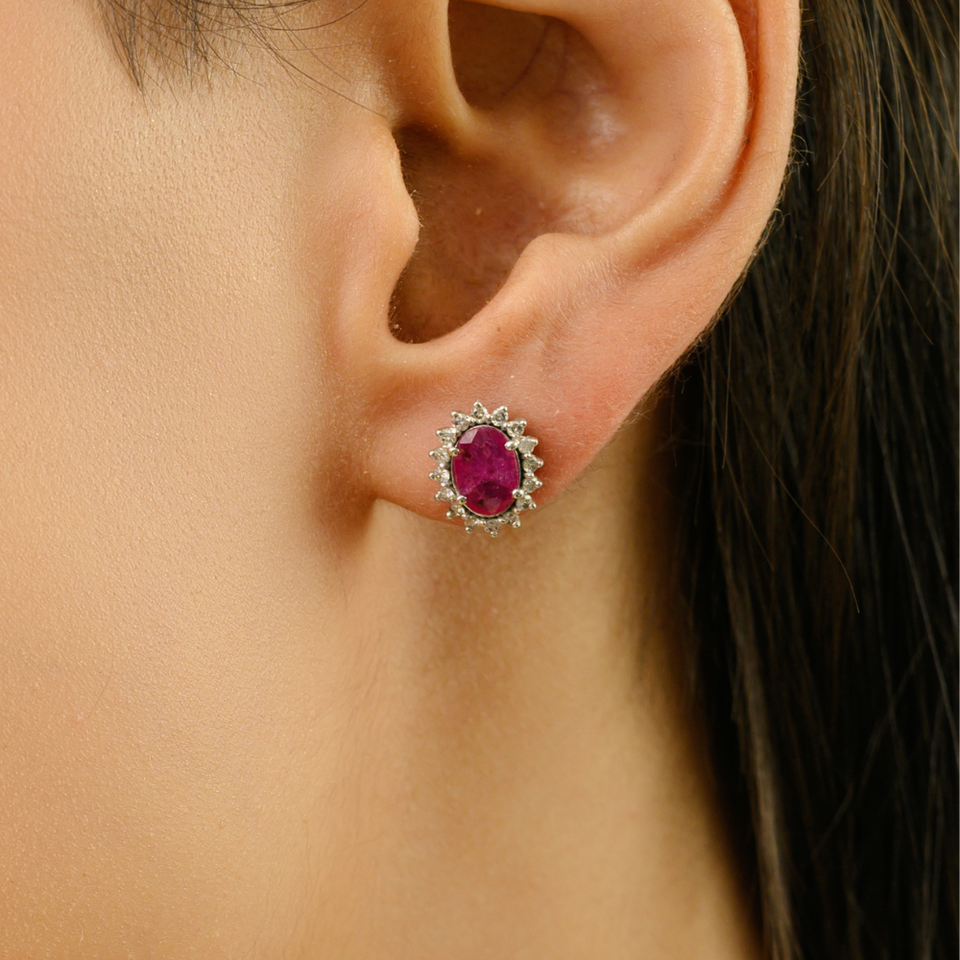Latest Design Gemstone 7x5 MM Ruby & Diamond Small Cluster Stud Earrings For Women 18K Real White Gold Jewelry Gift For Her