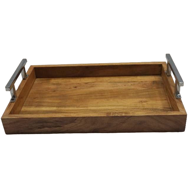 ถาดเสิร์ฟอาหารไม้พร้อมที่จับโลหะถาดเสิร์ฟอาหารงานไม้ด้วยมือดีไซน์ทันสมัยเครื่องครัวล่าสุดสำหรับโรงแรมและบ้าน