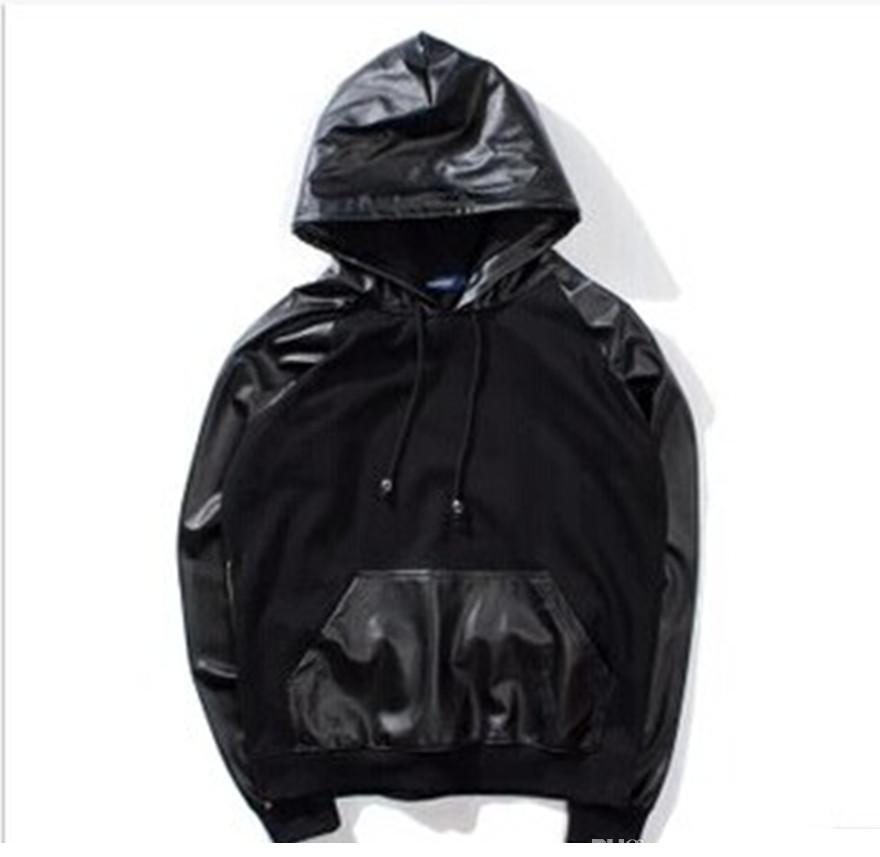 เสื้อมีฮู้ดฮิปฮอปหนังปะต่อสีดำแขนหนังฤดูหนาว