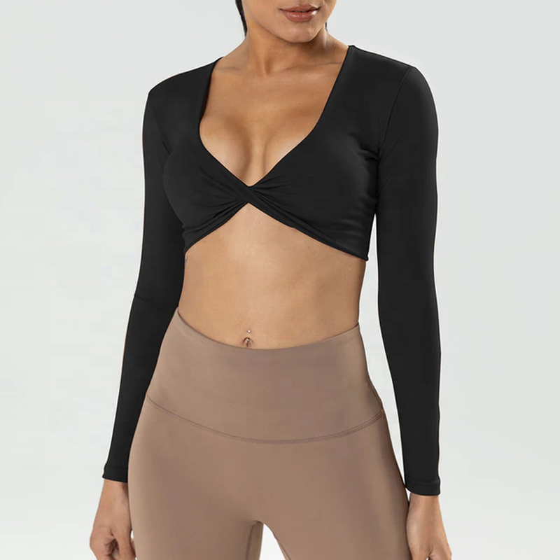 เสื้อครอปออกกำลังกายแขนยาวดีไซน์ล่าสุดสำหรับผู้หญิง คอวีลึกแบบบิดเกลียว เสื้อครอปออกกำลังกาย เสื้อโยคะ เสื้อครอปสำหรับเข้ายิม