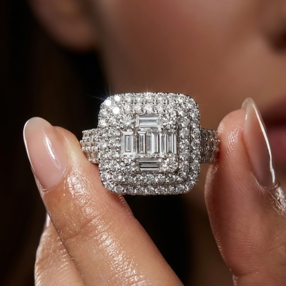 Latest Design Luxury Illusion Baguette Cluster 18 Karat White Gold Real Diamond Jewels Solitaire Ring for Female Gift