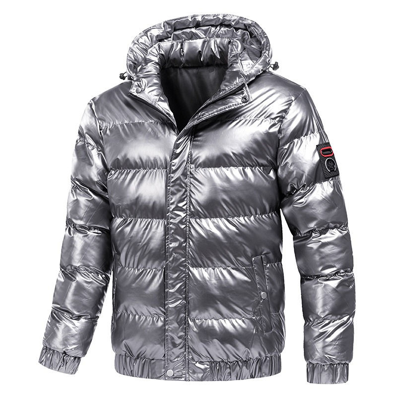 แจ็กเก็ตบุนวมโพลีเอสเตอร์สีเงินแวววาวมีฮู้ดสำหรับผู้ชายดีไซน์ล่าสุด