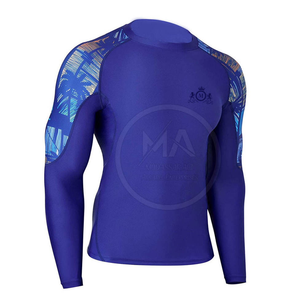 ชุดใส่เล่นกีฬากันผื่นแดงสำหรับผู้ชายชุดใส่เล่นกีฬาแขนยาวสีแดงติดโลโก้100% ผ้าโพลีเอสเตอร์แบบกำหนดเองระบายอากาศได้ดีดีไซน์ล่าสุด