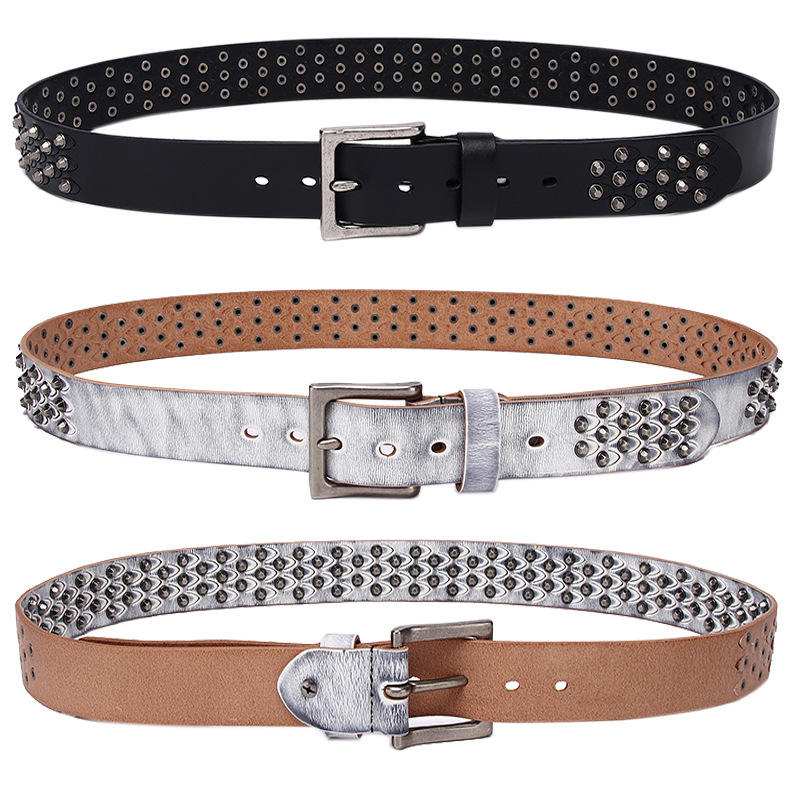 เข็มขัดหนังวัวแท้ ดีไซน์ล่าสุด สไตล์พังก์คาวบอย หัวเข็มขัดโลหะผสมทรงเจดีย์ ประดับตกแต่งด้วยหมุดโลหะ หนังแท้ HJ