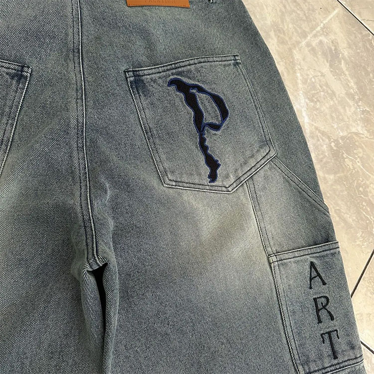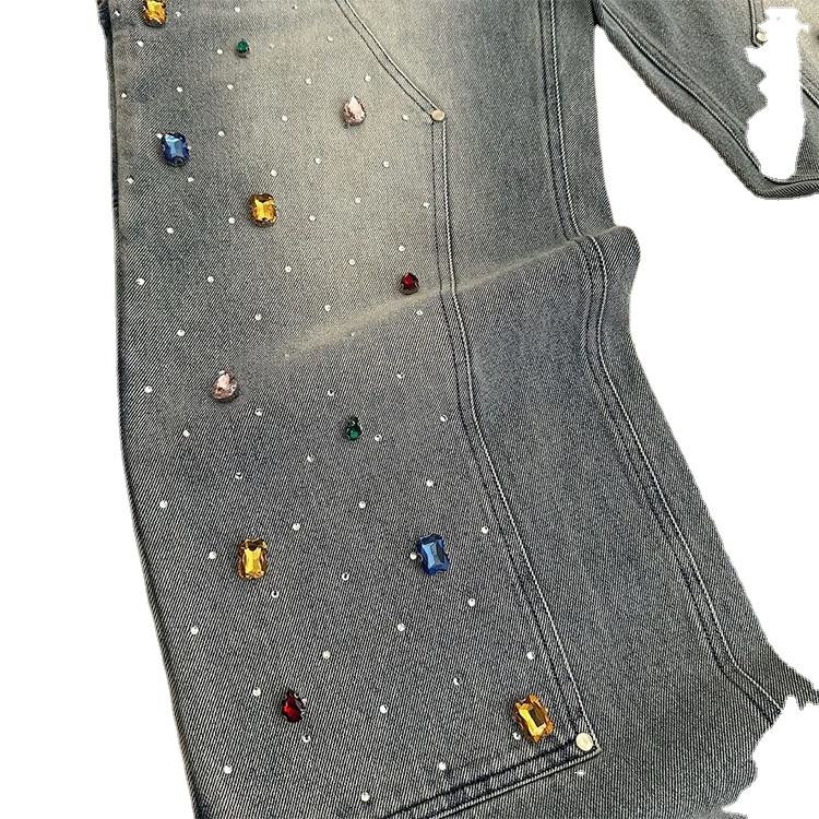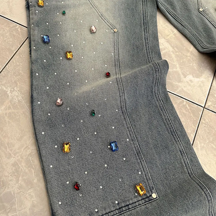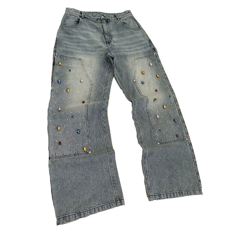 กางเกงยีนส์ดีไซน์ล่าสุด ประดับเพชร สไตล์สตรีทแวร์ กระเป๋าปะคู่ทรงแบ็กกี้ กางเกงยีนส์ทรงช่าง กางเกงยีนส์เดนิมทรงแบ็กกี้ประดับเพชรสำหรับผู้ชาย