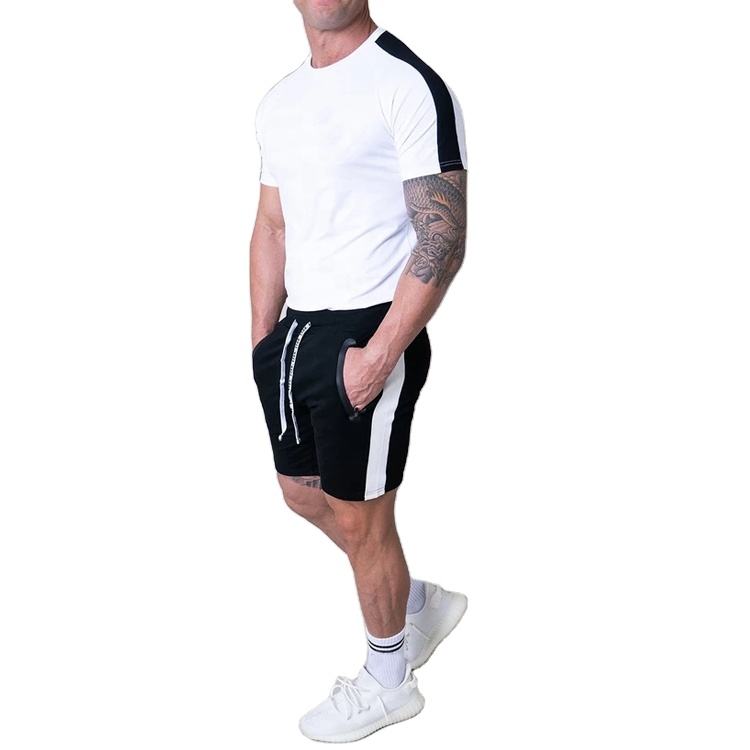 ล่าสุดการออกแบบชุดฤดูร้อนสำหรับผู้ชายผ้าฝ้าย100% สีบล็อกชุดเสื้อยืดและกางเกงขาสั้น