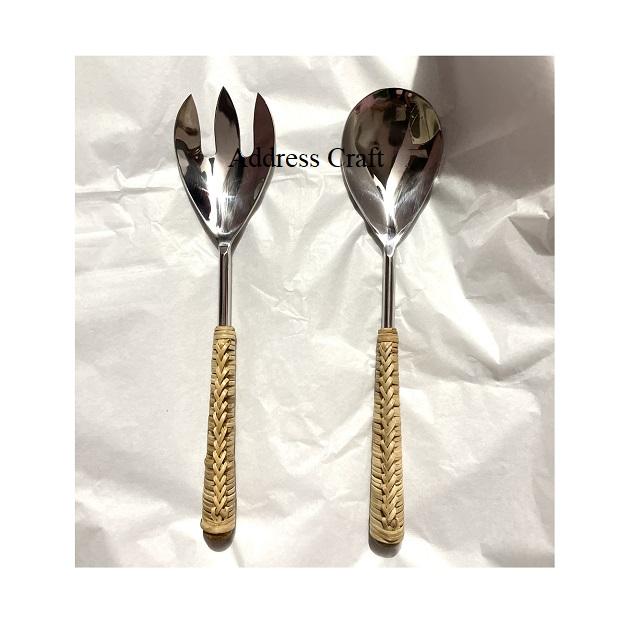 Latest Design Wicker Handle Steel Salad Server Set Kitchenware Salad Tools Best Selling Salad Spoon Fork Set With Rattan Handle