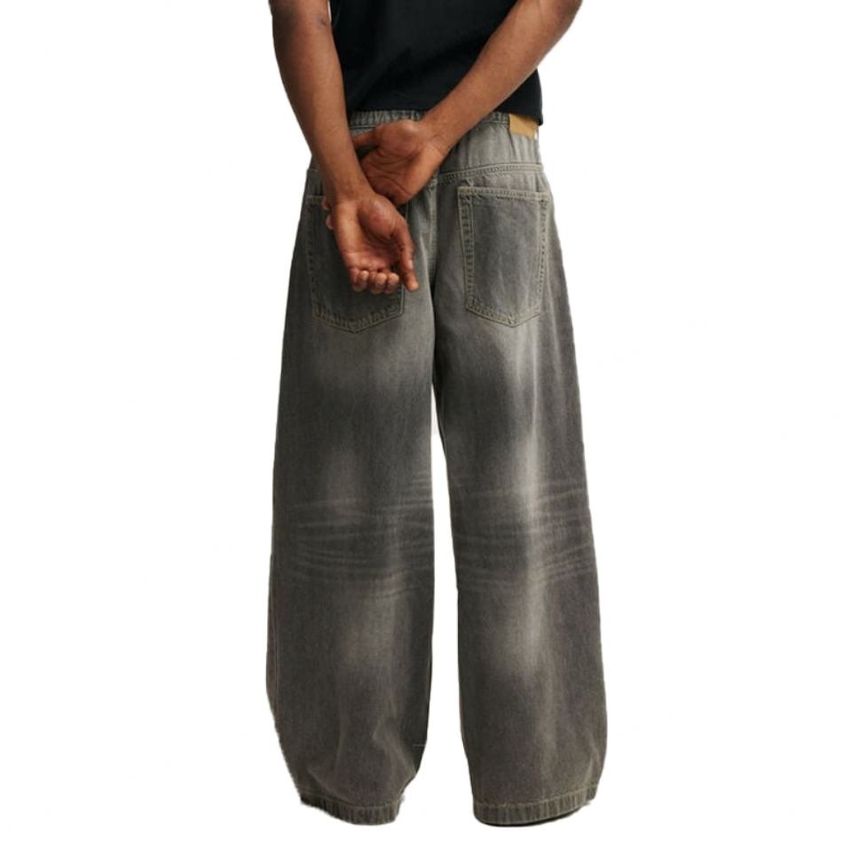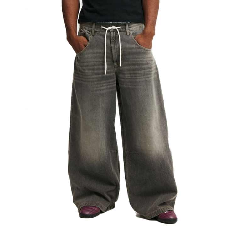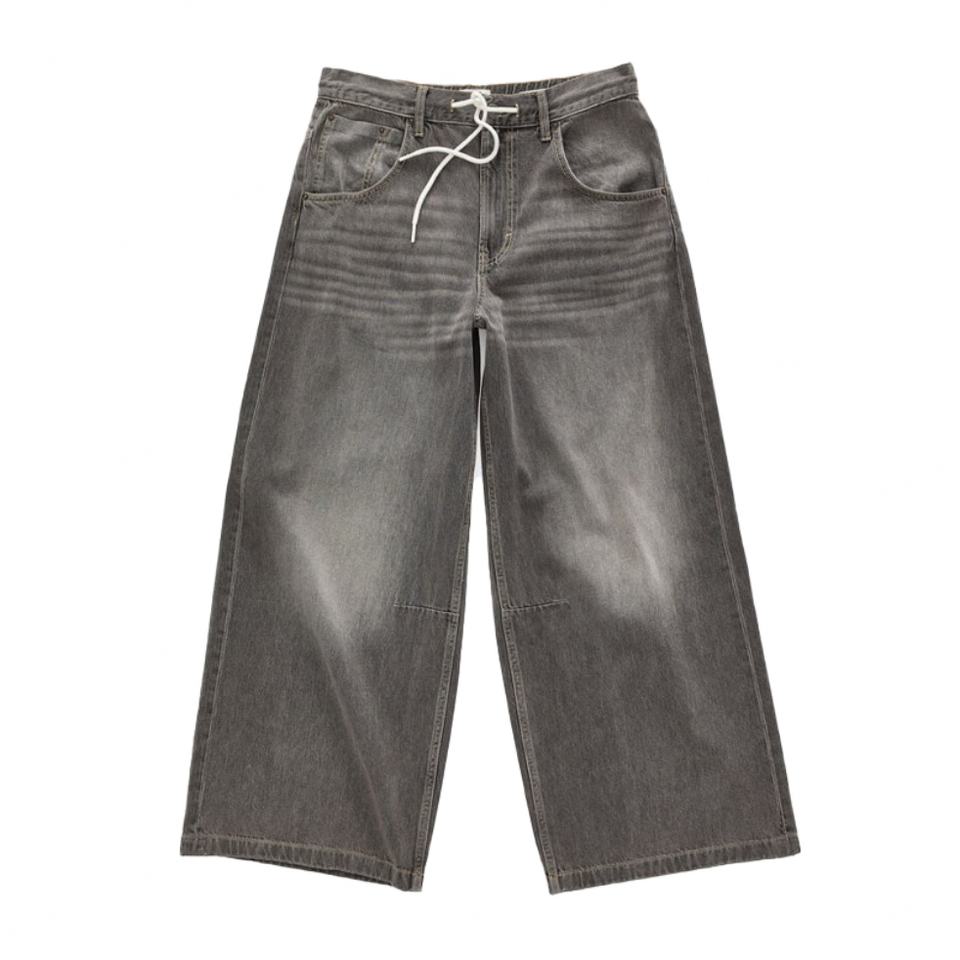 กางเกงยีนส์ทรงขาบานสีเทาเข้มสไตล์วินเทจ Y2K ลุคสตรีทแวร์ ดีไซน์ล่าสุด แต่งเชือกผูกเอว ทรงสเก็ตบอร์ด แบบสั่งทำพิเศษสำหรับผู้ชาย