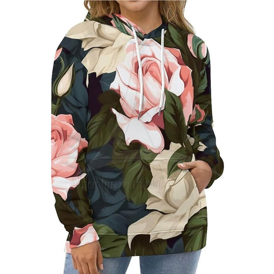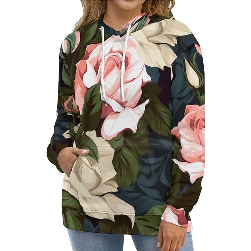 เสื้อฮู้ดดี้ผู้หญิงดีไซน์ล่าสุด ลายพิมพ์แบบซับลิเมชั่น สำหรับฤดูหนาว สวมใส่สบาย เป็นมิตรกับสิ่งแวดล้อม ระบายอากาศได้ดี สีและโลโก้ปรับแต่งได้ ผลิตในประเทศปากีสถาน