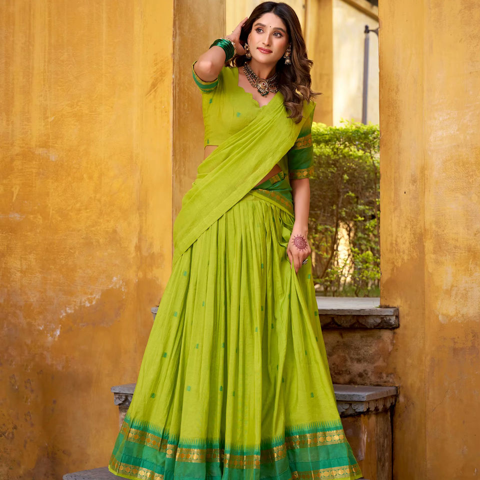 ชุดเลเฮนกาโชลีผ้าไหมชานเดรีลายทอแบบซารี ดีไซน์ล่าสุด สำหรับงานแต่งงานและงานเลี้ยงแบบอินเดียดั้งเดิม