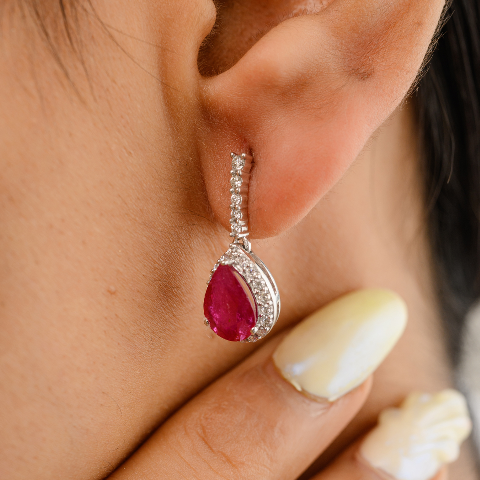 คอลเลกชันล่าสุดของนักออกแบบ100% ต่างหูแบบห้อยประดับเพชรและทับทิมแท้สีขาวและสีทอง14K