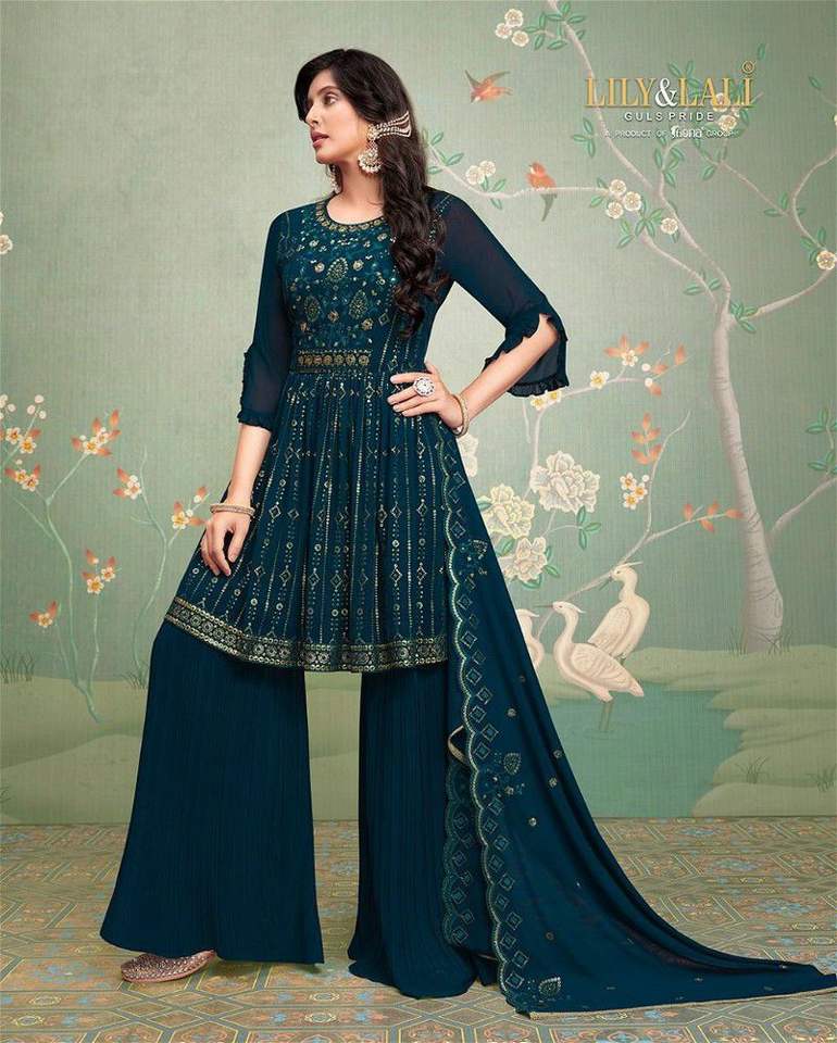 นักออกแบบล่าสุดการลําดับการเย็บปักถักร้อยเทียม Georgette ทํางานชุด Sharara โดย Fab Zone
