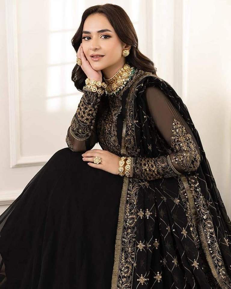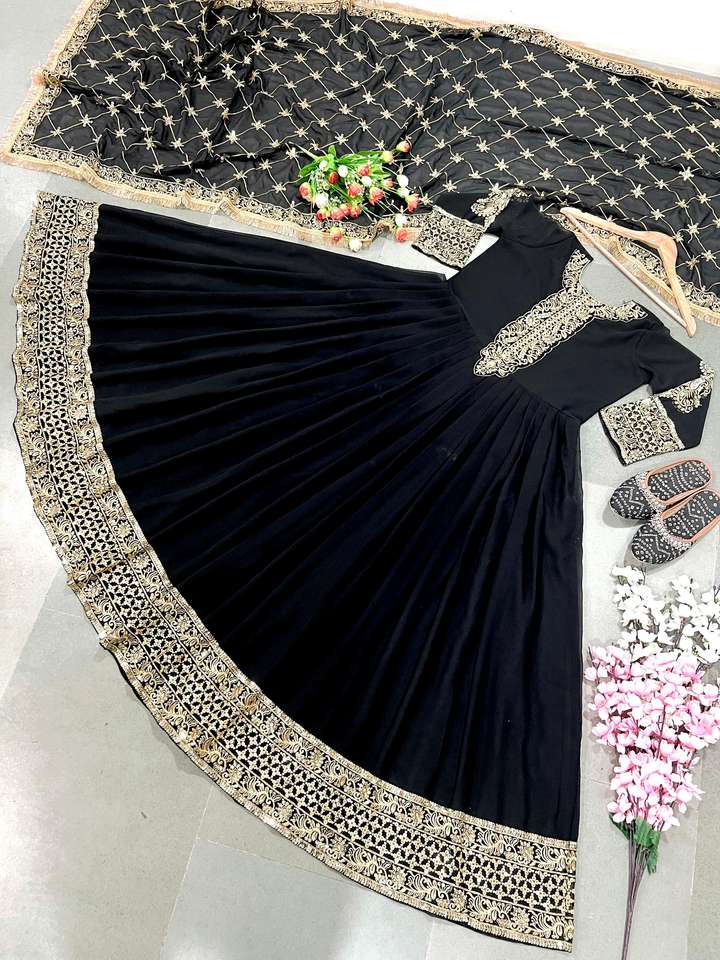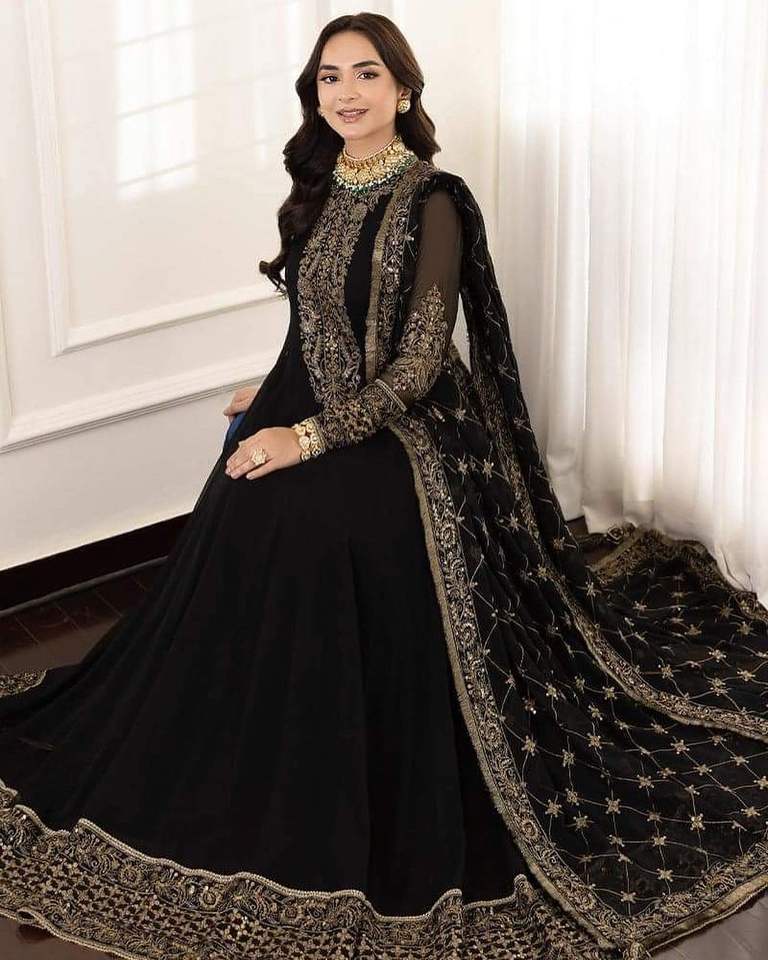 ชุดผ้าจอร์เจียแท้ anarkali ยาวจากนักออกแบบล่าสุดพร้อมงานเย็บปักถักร้อยตามลำดับสำหรับงานปาร์ตี้ตามเทศกาล
